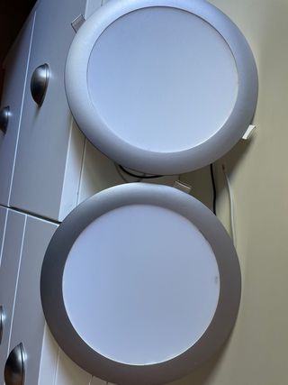 Se venden dos lámparas LED redondas con acabado plateado. Son ideales para iluminar cualquier espacio. - Diseño moderno y elegante. - Marco de aluminio. - Difusor de luz blanca. 6€ cada uno