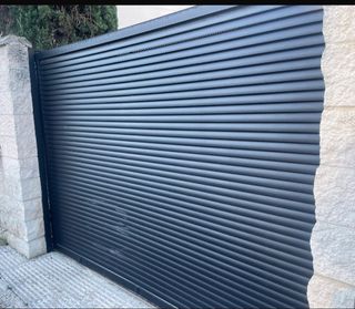 Puerta corredera de color negro, ideal para accesos Diseño de lamas horizontales. tiene un desperfecto en lamas por un golpe pero funciona bien se vende solo la puerta sin motor y sin herrajes “” MEDIDAS ULTIMA FOTO””