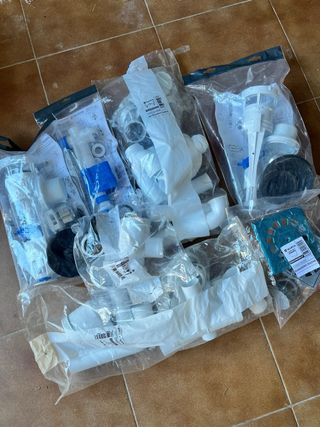 Lote de 7 accesorios de fontanería para diversas instalaciones. Marca Wurth, calidad de primera. Todos nuevos sin abrir. - 1 sifón botella válvula - 1 sifón botella doble - 1 sumidero de ducha - 1 sifón doble curvo - 2 descargas wc interrumpibles - 1 carga de cisterna dúo