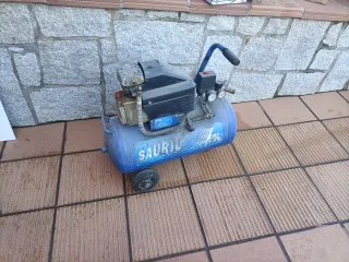 Compresor de aire de la marca SAURI con depósito de 50 litros y 2 caballos de potencia. Tiene roto el codo por lo demás el compresor funciona perfectamente - Depósito de 50L. - Motor de 2CV. - Ruedas para facilitar el transporte.