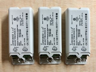 Se vende lote de tres transformadores ASWORHZ Ltd. ELECTRONICS modelo FUSION. Ideales para convertir corriente de 220V a 12V. Sirven tanto para lámparas halógenas como para leds de 12V. Se puede observar la compatibilidad en la fotografía adjunta - Marca: ASWORHZ Ltd. ELECTRONICS - Modelo: FUSION - Entrada: 220-240V 50Hz - Voltaje de salida: 12V 20W-60W - Tipo: SELV Tengo varios lotes