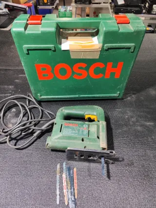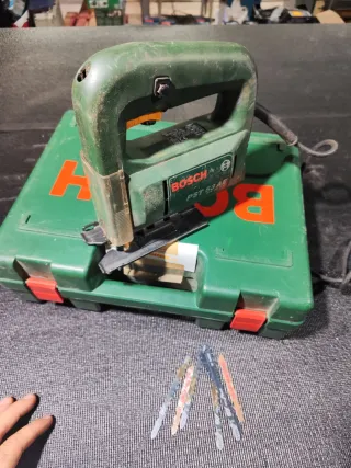 Sierra de calar Bosch PST 53 AE en buen estado, lista para usar. Incluye su maletín original y varias hojas de sierra. - Maletín de transporte verde. - Hojas de sierra variadas.