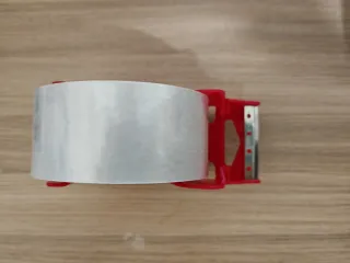 Rollo de cinta adhesiva transparente con un práctico dispensador rojo. Ideal para embalaje y reparaciones rápidas. - Cinta adhesiva transparente. - Dispensador de plástico rojo.