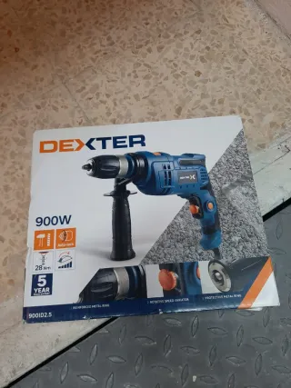 Taladro de impacto Dexter con motor reforzado. - Potencia: 900W - Capacidad de perforación en madera: 28mm - Capacidad de perforación en metal: 13mm - Capacidad de perforación en mampostería: 16mm - Velocidad sin carga: 0-3000 rpm - Peso: 1.75 kg - Función de bloqueo de gatillo