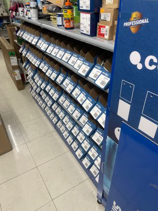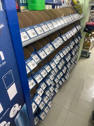 Expositor de la marca Cofan para tornillería completo mueble y producto, lleno completamente - Diseño de estantería. - Color azul.
