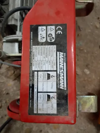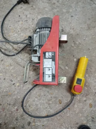 Maquinillo elevador para obras, con un brazo giratorio. Ideal para trabajos en altura.llamar 677403594 - Estructura principal de color rojo. - Motor eléctrico plateado. - Mando de control amarillo con botones.