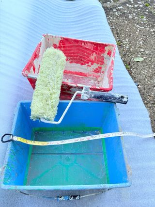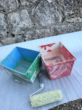 Se vende lote de dos cubos para pintura y un rodillo. El cubo verde con asas