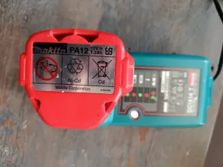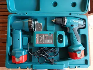 Set de herramientas Makita que incluye un maletín, taladro atornillador, cargador, una linterna y 2 baterías. Muy poco uso, las baterías están en muy buen estado con una buena duración -Baterias 12V - Taladro percutor Makita 6271D - Cargador Makita DC1414 T - Linterna Makita ML120 - Maletín de transporte.