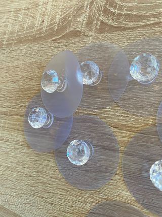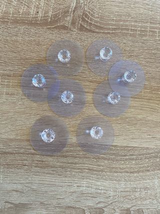 Set de 8 tiradores adhesivos con un diseño de diamante transparente. - Material: Plástico transparente. - Diseño: Forma de diamante facetado. - Adhesivo: Fácil de pegar y retirar. - Cantidad: 8 unidades.