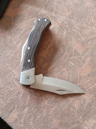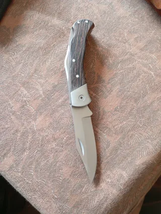 Herramienta con cachas de madera y detalles metálicos. Un accesorio práctico y con un diseño clásico. - Cachas de madera oscura. - Hoja de metal plateado. - Mecanismo de apertura.