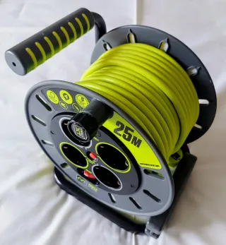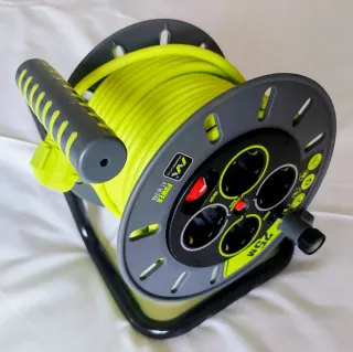 Enrollacable profesional de 25 metros con 4 tomas de corriente. - Color: Amarillo/Gris. - Marca: ProXT Luceco. - Longitud del cable: 25 m. - Número de tomas: 4.