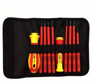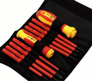 Set de destornilladores aislados para trabajos eléctricos. - Mango ergonómico bicolor (rojo y amarillo). - Varillas de acero con puntas variadas (Phillips y planas). - Marcaje de tamaño y voltaje (4500V) en cada destornillador. - Incluye funda organizadora de tela negra.