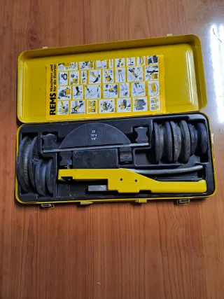Curvadora de tubos de la marca REMS. - Incluye juego de moldes para diferentes diámetros. - Molde 10 (3/8) - Molde 15 (5/8) - Molde 22 (7/8) - Molde 12 (1/2)