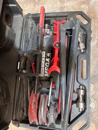 Kit de herramientas para fontanería, ideal para trabajos de cobre. - Curvador de tubos de precisión. - Cortatubos. De 5 medidas(8,10,12,14 un 16) - Escariador. - Abocardador. - Incluye cinta de teflón.