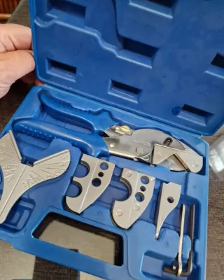 Herramienta versátil para cortar tubos, listones, perfiles, etc. - Incluye cortatubos y accesorios. - Diseñado para trabajos precisos. - Estuche organizador azul. Ruego no hagan ofertas. Envío sólo por correos.
