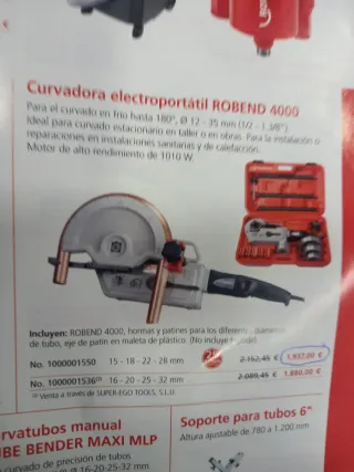Curvadora electroportátil ROBEND 4000 para curvado en frío hasta 180°. Ideal para instalaciones sanitarias y de calefacción. - Incluye hormas y patines para diferentes diámetros de tubo. - Motor de alto rendimiento de 1010 W. - Viene en maleta de plástico. - Se vende por jubilación.