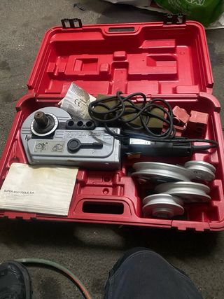 Herramienta para doblar tubos de la marca SUPER-EGO. - Incluye maletín rojo para transporte. - Juego de rodillos para diferentes diámetros. - Mango de presión. Negociable