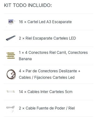 NO ENVIO!! Kit completo para escaparate inmobiliario. Ideal para mostrar propiedades. Incluye 18 carteles LED A3, 2 rieles para carteles LED, 1 juego de 4 conectores para riel, 4 pares de conectores deslizantes con cables y fijaciones para carteles LED, 14 cables intercarteles de 5cm y 2 cables para fuente de poder. Los carteles se ven en buen estado en la imagen.