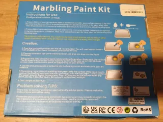 Kit de pintura para crear efectos de mármol. - 12 colores de tinte. - 20 hojas de papel para marmoleado. - Incluye 3 aplicadores. - Accesorios: peine, raspador, cuchara medidora, bandeja y carragenano.