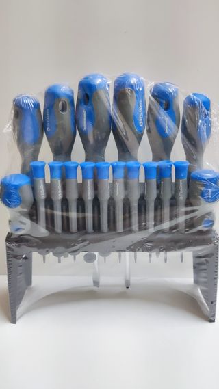 Juego de 18 destornilladores en soporte - Mango de 2 componentes da un agarre comodo para facilita el trabajo. - Práctico soporte mural, puede colgarse o fijar a la pared - Planos : 8 x 150 mm, 6 x 100 mm, 5 x 75 mm, 6 x 38 mm - Estrella: n° 3 x 150, n° 2 x 100 mm, n° 1 x 75 mm, n° 2 x 38 mm - Destornilladores de precisión 10 uni : planos 2,5 x 40 mm y 3 x 40 mm,phillips n° 0 x 40, n° 00 x 40 mm,trx t5, t6, t7, t8, t9 y t10 x 40 mm - Puedes combinar la compra con otros articulos de mi perfil - Recoger en mano Valdemoro ,envio por la aplicacion