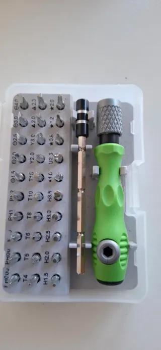 Compacto juego de destornilladores de precisión con 32 puntas intercambiables. Incluye un mango ergonómico y una práctica caja para guardarlo todo de 10x7 cm. - Se envían lotes de todo lo de mi perfil. - Mango verde y plateado. - Puntas variadas: PH000, PH00, PH0, PH1, PH2, Ø1.5, Ø2.0, Ø2.5, Ø3.0, Ø4.0, T4, T5, T6, T8, T10, T15, Y2.0, Y3.0, 2.0, 2.3, H1.5, H2.0, H2.5, H3.0, H3.5, 1.0, U2.3, 0.8, 1.2, 2.0.