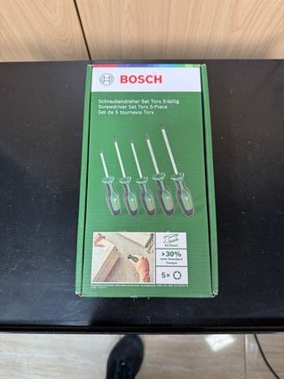 Vendo set original Bosch de 5 destornilladores Torx. ✔ Medidas: T10, T15, T20, T25, T30 ✔ Acero S2 de alta resistencia ✔ Hasta +30% más par que modelos estándar ✔ Mango ergonómico antideslizante ✔ Calidad Bosch Ideal para bricolaje, montaje de muebles, automoción y trabajos técnicos. Producto original Bosch. Se entrega con caja.