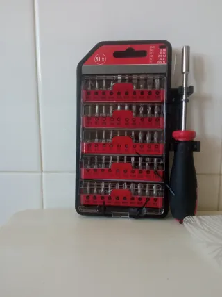Set de destornilladores de precisión con mango ergonómico. Nuevo sin usar. - Incluye mango y 32 puntas intercambiables. - Puntas de diferentes tipos y tamaños: PH, PZ, T, H. - Estuche organizador compacto.