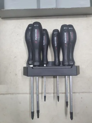Set de seis destornilladores cinceladores de la marca Parkside. - Mango ergonómico. - Punta cinceladora. - Incluye soporte para destornilladores. Gama parkside performance (profesional) Ojo el lote contiene los 6 destornilladores que ves en las fotos. No todos los que marca la caja. Ademas 2 de los destornilladores no se corresponden con 3l nombre que pone en el soporte. Se incluyen en el lote estos 6: Ph1, Ph3, Pz1, Pz3, T25 y T20 Fijarse bien que no quiero reclamaciones.