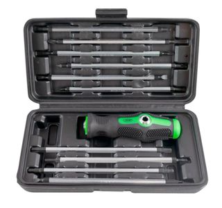 Práctico kit de destornillador con mango ergonómico y múltiples puntas intercambiables. - Mango de color verde con detalles plateados. - Incluye una barra de extensión magnética. - Variedad de puntas: PH00, PH0, P2, P41, T4, T5, T6, T8, T10, T15, Y2.0, Y3.0, U2.3, H1.5, H2.0, H2.5, H3.0, H3.5, 1.0, 1.2, 2.0, 2.3, 3.0, 4.0. - Estuche organizador.