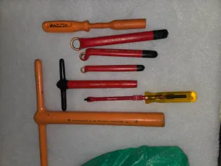 Conjunto de herramientas aisladas marca Palmera, diseñadas para trabajar con seguridad. - Mango en T con aislamiento. - Varias puntas y tamaños. - Marcaje de 1000V en varias piezas. - Destornillador con mango transparente.knipex wurth haupa wera wiha beta bahco todo nuevo excepto la llave en T Derancourt .El destornillador de tubo es Sibille
