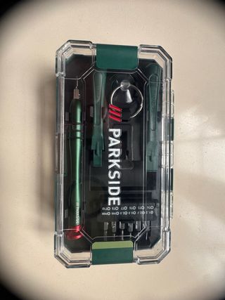 Set de destornillador de precisión Parkside con mango ergonómico y varios bits. - Mango de destornillador con punta magnética. - Incluye 10 puntas de diferentes tamaños y tipos (T4, T5, T6, T7, T8, T10, PH000, 1.2, 2.0, 0.8). - Dos palancas de plástico para abrir dispositivos. - Ventosa para extraer pantallas. - Anilla para colgar. - Solo abierto para sacar las fotos.