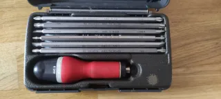 Juego de destornillador con mango en forma de T y un conjunto de puntas intercambiables. - Mango ergonómico de plástico negro y rojo. - Varilla metálica. - Soporte de puntas rojo. etiquetas: herramientas menaje herramienta manual manuales estuche bricolaje brico operario maletín set completo arreglos casa hogar operarios obrero obra clasico clásica classic antiguo antigua antigüedad antigüedades clásicos classic classique super acero