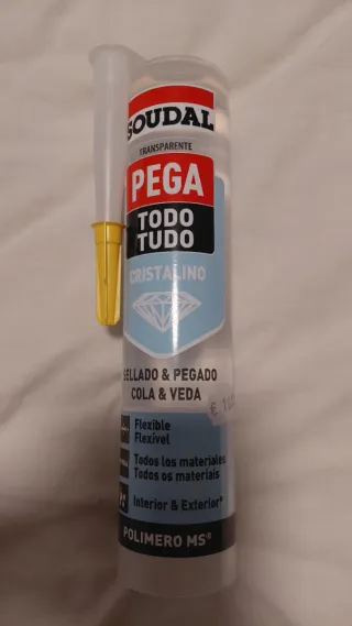 Adhesivo y sellador Soudal transparente. Precio original: 10, comprado en enero 2026. - Pega todo tipo de materiales. - Apto para interior y exterior. - Flexible y resistente. - Polímero MS.