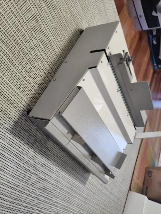 Máquina encuadernadora. - Estructura metálica blanca y gris. - Manivela con empuñadura negra. - Incluye alicate para el cierre final - Se regalan canutillos negros
