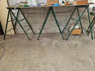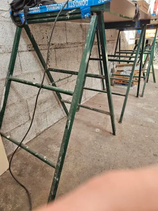 Se venden caballetes de obra metálicos en color verde. Son robustos y perfectos para trabajos de construcción o bricolaje. - 4 módulos de Caballete fijos con sujeta taladros: 1500 ancho × 850 alto *35€ cada módulo* - 2 módulos de Caballete fijos: 1750 ancho × 850 alto *35€ cada uno* - 3 caballetes de Obra plegable con cadena para fácil almacenamiento y transporte: 670 ancho × 1030 alto *25€ cada uno* - Estructura metálica resistente.