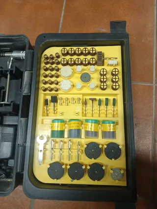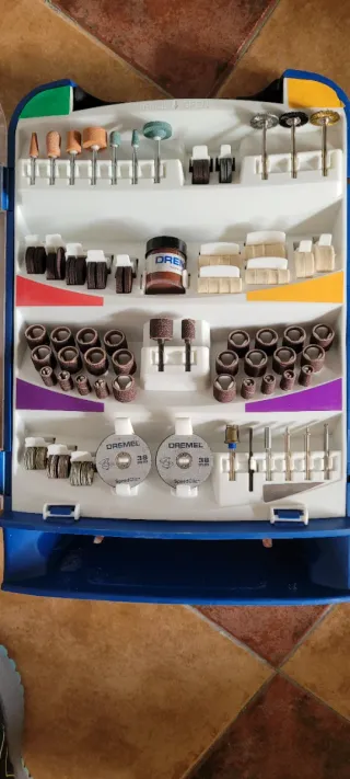 Pack completo de accesorios originales de la marca Dremel para multiherramientas rotativas. Ideal para trabajos de precisión, restauración y maquetismo. Dremel 684: Kit de limpieza y pulido (cepillos de cerdas, de acero, discos de fieltro y pasta de pulir). Prácticamente completo. Set de 7 brocas Dremel: Brocas de precisión para metal/madera (medidas desde 0.8mm a 3.2mm). Caja organizadora extra: Incluye multitud de repuestos: bandas de lijado, discos de corte, piedras amoladoras y mandriles.