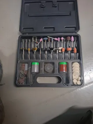 Herramienta Dremel inalámbrica con con muchos accesorios tanto de estética para las uñas como de bricolaje. Esta herramienta se puede usar para esas dos cosas. Tiene muy poco uso y su batería dura de dos a tres horas. Tiene tres velocidades incluye muchos accesorios y un maletín rígido y compacto