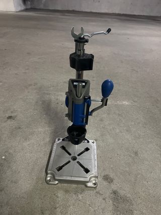 Soporte para taladro Dremel, ideal para trabajos de precisión. - Base estable y robusta. - Columna de metal cromado. - Mango de sujeción azul. Precio no negociable.