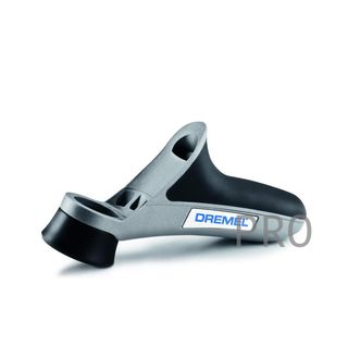 Empuñadura ergonómica para herramientas Dremel. Su diseño permite un agarre cómodo y seguro. - Color gris con detalles en negro. - Logotipo de Dremel visible.