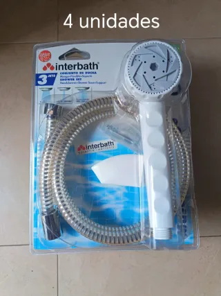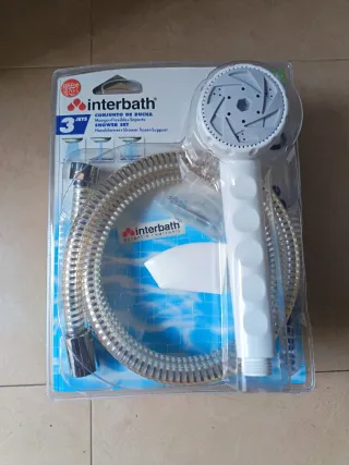 Conjunto de ducha Interbath que incluye mango, flexo y soporte. Ideal para renovar tu baño. - Mango de ducha con 3 jets. - Flexo de ducha. - Soporte para el mango. Precio por unidad 8€