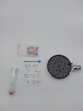No sé muy bien el estado ya que estaba en un piso que compré, no lo he llegado a usar nunca y lo he quitado para poner uno que me han regalado. Tienen algo de yeso pero se quita fácilmente. Incluye: - Plafón superior. - Barra. - Grifo termostático. - El desviador que tenía más otro que compré yo. - Ducha inferior. - Varios fexos. - Soporte para poner los botes de gel. - Fabricado en metal y plástico. - Acabado plateado.