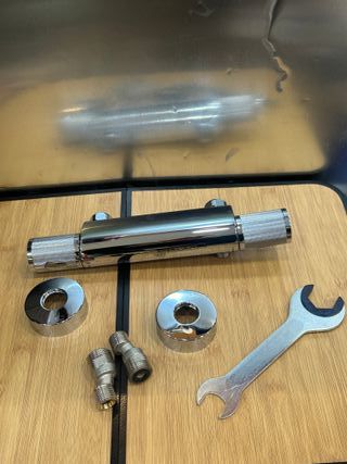Conjunto de accesorios para grifo de ducha con acabado cromado. - Cuerpo principal del grifo termostático. - Cuerpo inferior con conexiones para agua fría y caliente. - Dos embellecedores circulares. - Varios conectores y adaptadores metálicos. - Filtro de malla.