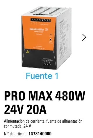 Fuente de alimentación Weidmuller PROmax 24V, 480w. Esta NUEVA, sin usar ni montada nunca en un armario. Otras características. - Modelo: PRO MAX 480W 24V 20A. - tension Entrada 230Vac - Voltaje de salida: 24V. - Corriente de salida: 20A. - Número de artículo: 1478140000.