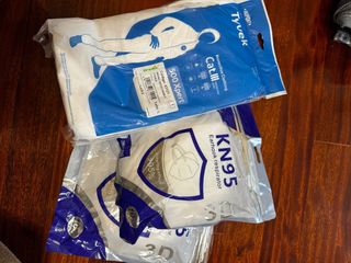 Conjunto de protección personal que incluye un traje desechable y mascarillas. - Traje Tyvek talla L, modelo 500 Xpert. - 2 paquetes de mascarillas KN95, cada uno con 10 unidades.