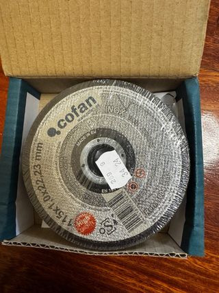 Caja de 25 discos de corte Cofan para acero inoxidable. - Medidas: 115 x 1,0 x 22,23 mm. - Material: Acero inoxidable. - Certificación: EN 12413, ISO 9001. - Fabricado en la UE.