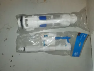 Conjunto de descargador y flotador para cisterna de inodoro. De varillas roscadas - Componentes de plástico. - Combinación de colores azul y blanco.