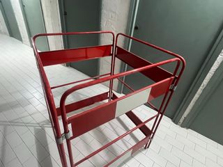 Valla de protección metálica, ideal para delimitar espacios o como barrera temporal. Su diseño plegable facilita su almacenamiento y transporte. - Fabricada en metal resistente. - Color rojo con bandas reflectantes blancas.