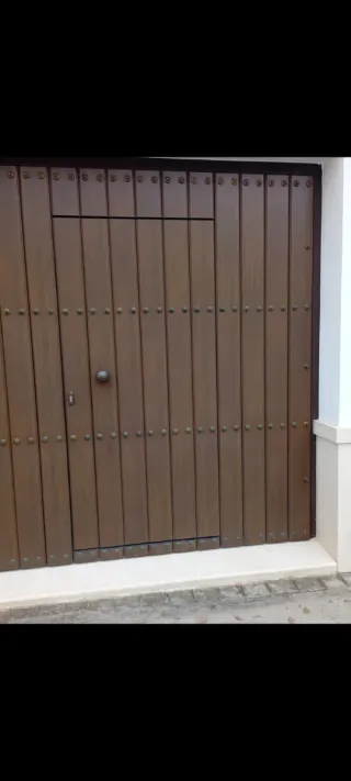 Puerta de garaje de madera con un diseño clásico y elegante. - Acabado en tono marrón. - Detalle de pequeños remaches. - Incluye una puerta peatonal integrada. - Tirador metálico.