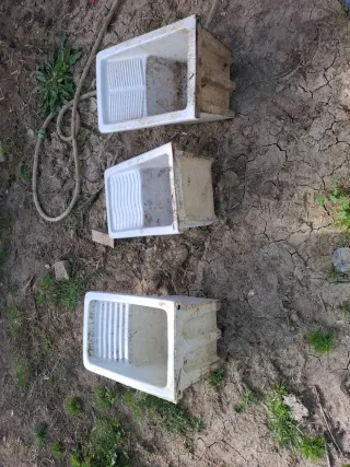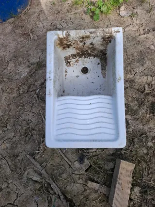 Pileta de lavar antigua, ideal para proyectos de restauración o decoración rústica. - Material: Cerámica blanca. - Diseño con superficie acanalada para frotar. - Agujero para desagüe. Tengo 3 a 10 euros cada una No estan rotas solo sucias