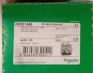 Interruptor diferencial Schneider Electric Acti9 - IID. - Modelo: A9R81440 - Tipo: 4P-40A-30mA-AC - Tensión: 400V/415V - Fabricado en España